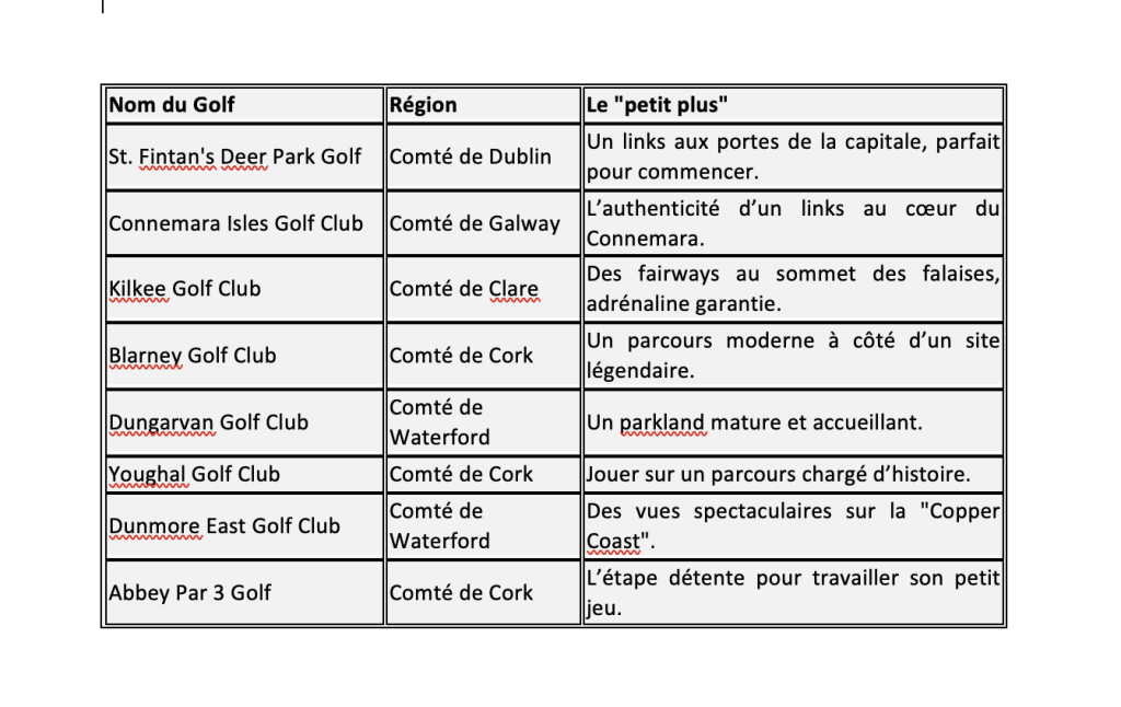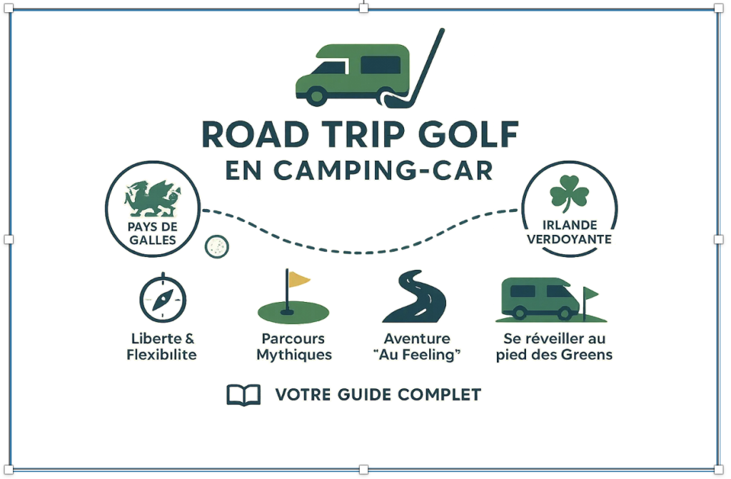 Fatigué de jongler entre vos deux passions, le golf et la liberté du camping-car ? Vous rêvez d’un road trip qui mêle greens mythiques et paysages à couper le souffle, mais vous ne savez pas par où commencer ? Faites un tracé de tous les golfs sur la carte de l’Irlande et Pays de Galles. Je vous guide sur les parcours de Clyne, St. Fintan’s Deer Park, Blarney, Kilkee et Connemara Isles, avec pour chaque golf, des sites à visiter à côté : de la Wild Atlantic Way aux Cliffs of Moher, vivez une aventure où liberté rime avec swing parfait.