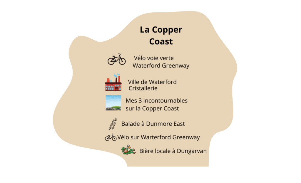 La Waterford Greenway relie les deux villes en 48 km de pistes cyclables. Ce sentier serpente entre monts et mer avec viaducs et tunnel historique. Le tronçon entre Durrow et Dungarvan, idéal pour les familles, cumule 4.8/5 sur Tripadvisor. Profitez-en pour visiter le château de Dungarvan ou longer la côte en vélo à la recherche de vues imprenables.